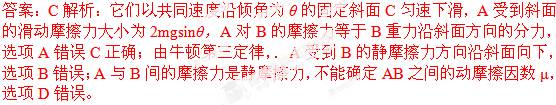 | A、A和B之间没有静摩擦力 | B、A受到B的静摩擦力方向沿斜面向上 | C、A与B间的动摩擦因数μ=tanθ | D、A受到斜面的滑动摩擦力大小为2mgsinθ |