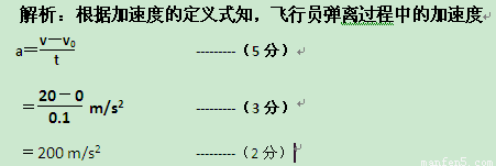 (6分)我国空军科研人员在飞机零高度、零速度的救生脱险方面的研究已取得成功.由于飞机发生故障大多是在起飞、降落阶段,而此时的高度几乎为零高度.另外在飞行过程中会出现突然停机现象,在这种情况下,飞行员脱险非常困难.为了脱离危险,飞行员必须在0.1 s的时间内向上弹离飞机,若弹离飞机的速度为20 m/s,试判断弹离飞机过程的加速度是多大.