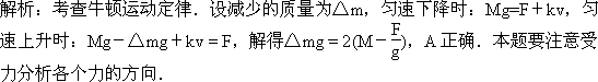 一质量为M的探空气球在匀速下降,若气球所受浮力F始终保持不变,气球在运动过程中所受阻力仅与速率有关,重力加速度为g.现欲使该气球以同样速率匀速上升,则需从气球吊篮中减少的质量为