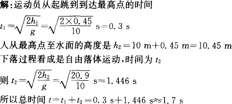 分析:这里研究的是运动员的滞空时间,而不是其动作的花样,所以可把运动员当做质点,运动规律是竖直上抛运动,只是抛出点和落水点不在同一水平面上. |