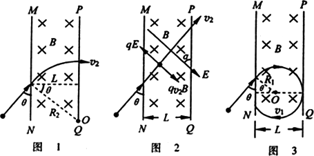 (1)如图1所示,经电压 加匀强电场后,粒子在磁场中沿直线运动射出PQ边界的条件为Eq=Bq 由此可得出 (2)经电压