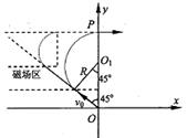 (16分)如图所示,在xoy平面内第二象限的某区域存在一个矩形匀强磁场区,磁场方向垂直xoy平面向里,边界分别平利于x轴和y轴。一电荷量为e、质量为m的电子,从坐标原点为O以速度v0射入第二象限,速度方向与y轴正方向成45°角,经过磁场偏转后,通过P(0,a)点,速度方向垂直于y轴,不计电子的重力。![]()
