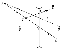 如图所示,AB、OC是从点光源S(图中未画出)发出的光经透镜折射后的光线,试在图中用作图法确定光源S的位置.