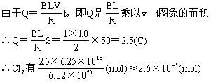 导轨两边用导线与两碳棒相连,碳棒插入CuCl2溶液中,导轨相距1m,B=0.1T,已知导棒电阻2Ω,其余电阻不计,已知导棒运动如图所示,求最多析出多少摩尔的Cl2气,并写出电极反应式.![]()