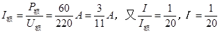 如图所示,理想变压器原、副线圈匝数之比为20:1,原线圈接正弦交流电源,副线圈接入“220V60W”灯泡一只,且灯泡正常发光,则( )