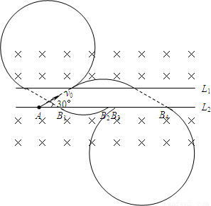 ÈçͼËùʾ£¬L1ºÍL2ΪÁ½ÌõƽÐÐÏߣ¬L1ÉÏ·½ºÍL2Ï·½¶¼ÊÇ´¹Ö±Ö½ÃæÏòÀïµÄ´Å¸ÐӦǿ¶ÈÏàͬµÄ×ã¹»´óÔÈÇ¿´Å³¡£¬L1ÓëL2Ö®¼äÎªÕæ¿ÕÇøÓò£®A¡¢BÁ½µã¶¼ÔÚL2ÉÏ£®´øµçÁ£×Ó£¨²»¼ÆÖØÁ¦£©´ÓAµãÒÔ³õËÙvÓëL2³É¦È=30°Ð±ÏòÉÏÉä³ö£¬Á£×ÓµÚÒ»´ÎбÏòÉÏ´©¹ýL2ʱ£¬½«¸Ãµã±ê¼Ç×÷Bµã£®ÏÂÁÐÅжÏÕýÈ·µÄÊÇ£¨ £©A£®Á£×ÓÒ»¶¨´øÕýµç