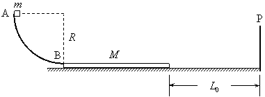 处有一竖直固定的挡板P.一物块从A点由静止开始沿轨道滑下,经B滑上滑板.已知物块可视为质点,质量为m,滑板质量M = 2m,圆弧轨道半径为R,物块与滑板间的动摩擦因数为μ = 0.5,重力加速度为g.滑板与挡板的碰撞没有机械能损失,滑板返回B点时即被锁定.