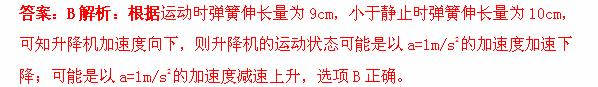 (2013哈尔滨三中月考)如图所示,升降机天花板上用轻弹簧悬挂一物体,升降机静止时弹簧伸长量为10cm,运动时弹簧伸长量为9cm,则升降机的运动状态可能是(g=10m/s2):