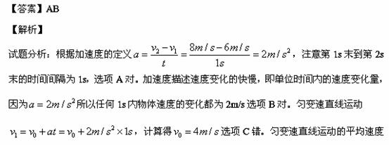 物体做匀加速直线运动,已知第1s末的速度为6 m/s,第2s末的速度为8m/s,则下列结论中正确的是