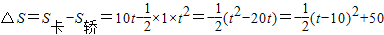 【答案】分析:(1)由题卡车做匀速运动,轿车做匀加速运动,根据运动学公式,列出两车之间距离与时间的关系式,根据数学求出何时两车距离最大.