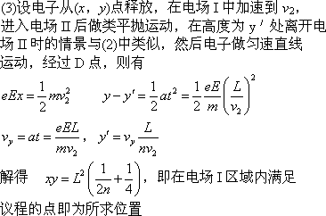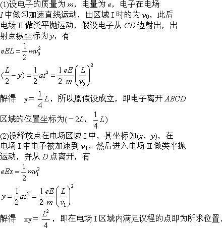 (3)若将左侧电场II整体水平向右移动L/n(n≥1),仍使电子从ABCD区域左下角D处离开(D不随电场移动),求在电场I区域内由静止释放电子的所有位置.