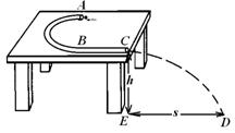 ÈçͼËùʾ£¬ÓÃÄڱڹ⻬µÄ±¡±ÚϸԲ¹ÜÍä³ÉµÄÓɰëÔ²ÐÎAPB£¨Ô²°ë¾¶±Èϸ¹ÜµÄÄÚ¾¶´óµÃ¶à£©ºÍÖ±ÏßBC×é³ÉµÄ¹ìµÀ¹Ì¶¨ÔÚˮƽ×ÀÃæÉÏ£¬ÒÑÖªAPB²¿·ÖµÄ°ë¾¶R£½1.0 m£¬BC¶Î³¤L£½1.5m¡£µ¯Éä×°Öý«Ò»¸öСÇò(¿ÉÊÓΪÖʵã)ÒÔv0£½5m/sµÄˮƽ³õËÙ¶È´ÓAµãµ¯Èë¹ìµÀ£¬Ð¡Çò´ÓCµãÀ뿪¹ìµÀËæ¼´Ë®Æ½Å׳ö£¬Â䵨µãDÀ뿪CµÄˮƽ¾àÀës£½2m£¬²»¼Æ¿ÕÆø×èÁ¦£¬gÈ¡10m/s2¡£Çó£º
