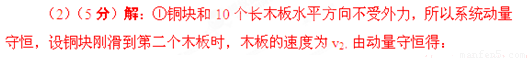 如图所示,水平光滑地面上依次放置着质量m=0.08kg的10块完全相同长直木板。一质量M=1.0kg大小可忽略的小铜块以初速度v0=6.0m/s从长木板左侧滑上木板, 当铜块滑离第一块木板时,速度大小为v1=4.0m/s。铜块最终停在第二块木板上。(g=10m/s2,结果保留两位有效数字)求: