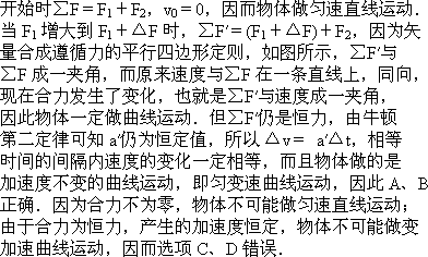 一个质点受两个互成直角的力F1和F2作用,由静止开始运动,若运动中保持二力方向不变,但F1突然增大到F1+ΔF,则质点此后