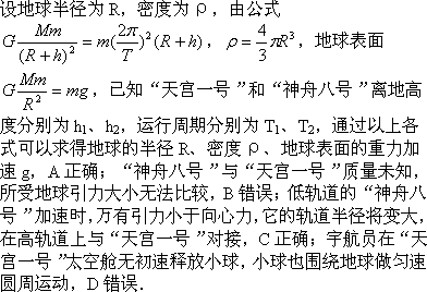 承载着我国载人飞船和空间飞行器交会对接技术的“天宫一号”已于2011年9月29日成功发射,随后将发射“神舟八号”飞船并与其实现交会对接.假设“天宫一号”和“神舟八号”匀速圆周运动的轨道如图所示,A代表“天宫一号”,B代表“神舟八号”,虚线为各自的轨道.“天宫一号”和“神舟八号”离地高度分别为h1、h2,运行周期分别为T1、T2,引力常量为G,则以下说法正确的是
