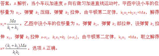 (2012年5月湖北武汉模拟)如图甲、乙所示,在水平面上运动的小车内,有一质量为M的物体与两根劲度系数分别为k1、k2的弹簧连接。开始时两弹簧均未发生形变,不计物体与小车间的摩擦。当小车以加速度a向右做匀加速直线运动时,甲、乙两图中物体相对于小车的位移量分别为: