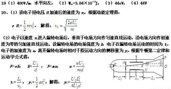 ÈçͼËùÊ¾ÎªÒ»Õæ¿Õʾ²¨¹Ü£¬µç×Ó´ÓµÆË¿K·¢³ö£¨³õËٶȲ»¼Æ£©£¬¾µÆË¿ÓëA°å¼äµÄ¼ÓËÙµçѹU1¼ÓËÙ£¬´ÓA°åÖÐÐÄ¿×ÑØÖÐÐÄÏßKOÉä³ö£¬È»ºó½øÈëÁ½¿éƽÐнðÊô°åM¡¢NÐÎ³ÉµÄÆ«×ªµç³¡ÖУ¨Æ«×ªµç³¡¿ÉÊÓΪÔÈÇ¿µç³¡£©£¬µç×Ó½øÈëM¡¢N¼äµç³¡Ê±µÄËÙ¶ÈÓëµç³¡·½Ïò´¹Ö±£¬µç×Ó¾¹ýµç³¡ºó´òÔÚÓ«¹âÆÁÉϵÄPµã¡£ÒÑÖª¼ÓËÙµçѹΪU1£¬M¡¢NÁ½°å¼äµÄµçѹΪU2£¬Á½°å¼äµÄ¾àÀëΪd£¬°å³¤ÎªL1£¬°åÓҶ˵½Ó«¹âÆÁµÄ¾àÀëΪL2£¬µç×ÓµÄÖÊÁ¿Îªm£¬µçºÉÁ¿Îªe¡£
