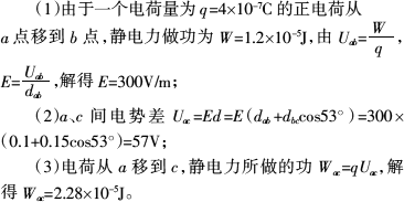 答案:(1)E=300 V/m (2)57 V (3)2.28×10-5 J 提示: |