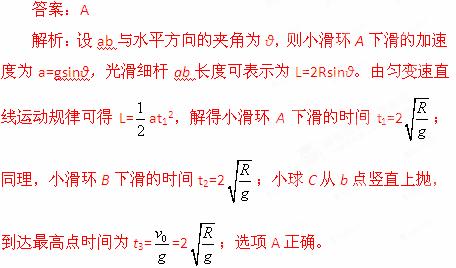 (2013河南漯河市联考)如图所示,ab、cd是竖直平面内两根固定的光滑细杆,a、b、c、d位于同一圆周上,圆周半径为R,b点为圆周的最低点,c点为圆周的最高点。现有两个小滑环A、B分别从a、c处由静止释放,滑环A经时间t1从a点到达b点,滑环B经时间t2从c点到达d点;另有一小球C从b点以初速度v0=