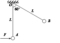 的两个可视为质点的小球A、B,分别被长为L的绝缘细线悬挂在同一点O,给A、B分别带上一定量的正电荷,并用水平向右的外力作用在A球上,平衡以后,悬挂A球的细线竖直,悬挂B球的细线向右偏60°角,如图所示。若A球的带电量为