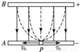 如图所示,A、B为两块足够大的平行金属板,两板间距离为d,接在电压为U的电源上.在A板的中央P点处放置一个电子放射源,可以向各个方向释放电子.设电子的质量为m、电荷量为e,射出的初速度为v.求电子打在B板上的区域面积.