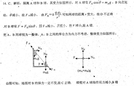 如右下图所示,竖直墙面与水平地面均光滑且绝缘,两个带有同种电荷的小球A、B分别处于竖直墙面和水平地面,且共处于同一竖直平面内,若用图示方向的水平推力F作用于小球B,则两球静止于图示位置,如果将小球B稍向左推过一些,两球重新平衡时的受力情况与原来相比( )