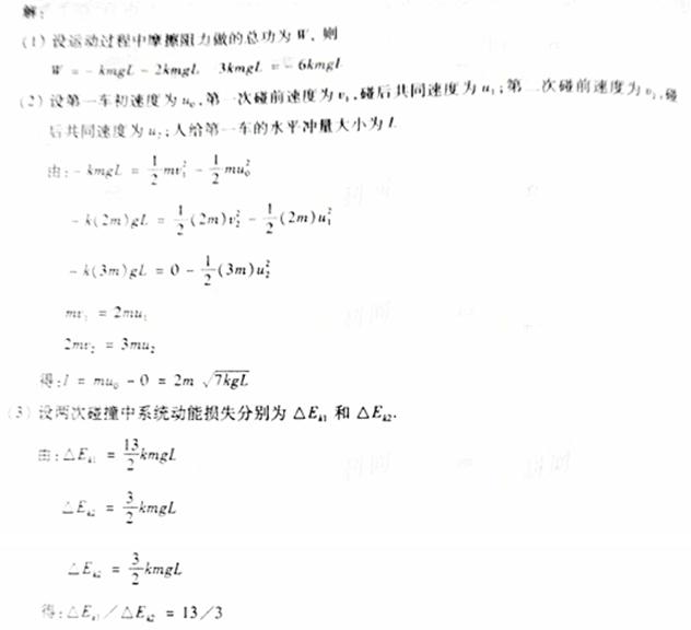 如图所示,静置于水平地面的三辆手推车沿一直线排列,质量均为m,人在极端的时间内给第一辆车一水平冲量使其运动,当车运动了距离L时与第二辆车相碰,两车以共同速度继续运动了距离L时与第三车相碰,三车以共同速度又运动了距离L时停止。车运动时受到的摩擦阻力恒为车所受重力的k倍,重力加速度为g,若车与车之间仅在碰撞时发生相互作用,碰撞时间很短,忽略空气阻力,求:![]()
