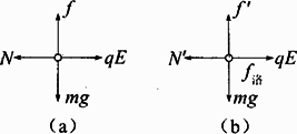 解:开始小球受力见图(a),N=qE,mg>μqE,∴小球加速向下运动,以后小球受洛仑兹力(如图(b),相应N,f均增加,小球加速度减小,速度仍在增加,只是增加得慢了,洛仑兹力、弹力、摩擦力将随之增加,合力继续减小,直到加速度a=0时,小球速度达到最大值后匀速,有