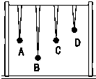 在一根横绳上悬挂4个双线摆,其中A与B摆长相等,当使A自由摆动起来后,其它几个摆也随之摆动,周期分别设为TA、TB、TC、TD,则周期间的大小关系是 ,B、C、D中摆幅最大的是 。![]()