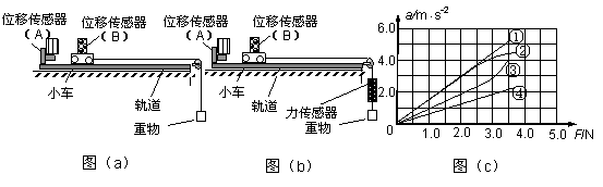 在“研究小车加速度与所受合外力的关系”实验中时,甲、乙两实验小组引进“位移传感器”、“力传感器”,分别用如图(a)、(b)所示的实验装置实验,重物通过细线跨过滑轮拉相同质量小车,位移传感器(B)随小车一起沿水平轨道运动,位移传感器(A)固定在轨道一端.在运动过程中位移传感器(B)发出信号,位移传感器(A)接收信号且显示小车运动的位移。甲组实验中把重物的重力作为拉力F,乙组直接用力传感器测得拉力F,改变重物的重力重复实验多次,记录多组数据,并画出a-F图像。