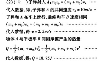 质量为m2=1.5kg的平板车B停放在光滑的水平面上,左端放置着一块质量为m1=450g的物体A,一颗质量为m0= 50g的子弹以v0=100m/s的速度水平瞬间射入物体A并留在A中,平板车B足够长.