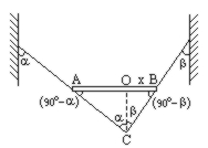 如图, 重力为G的不均匀棒被两根轻质绳悬挂呈水平状态. 两绳与竖直方向夹角分别为α=51°, β=38°. 棒长L为6.0m. 重心离B端距离x为_____m.