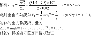 若实验中所用重锤的质量m=1 kg,打点纸带如图所示.打点时间间隔为0.02 s,则记录B点时,重锤速度vb=________,重锤动能Ek=________,从开始下落起至B点重锤的重力势能减少量是________,由此可得出结论是________.