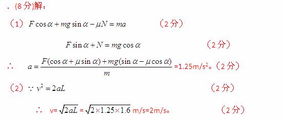 (2013届江西省重点中学高三联考)如图所示,质量m=1Kg的小球穿在长L=1.6m的斜杆上,斜杆与水平方向成α=37°角,斜杆固定不动,小球与斜杆间的动摩擦因数μ=0.75。小球受水平向左的拉力F=1N,从斜杆的顶端由静止开始下滑(