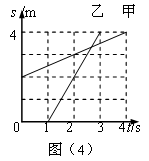 甲质点在t=0时刻从O点右方2m处出发,向右做速度为0.5m/s的匀速直线运动,乙质点在t=1s时刻从O点出发,向右做速度为2m/s的匀速直线运动,规定向右为正方向,试在图(4)中作出两质点运动的s-t图。![]()