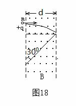 如图18所示,一重力不计带正电的粒子,电量为q,以速度υ垂直于匀强磁场的边界射入磁场中,磁场的宽度为d,磁感强度为B,粒子能够从另一边界射出,穿透磁场时速度方向与粒子原来入射方向的夹角是30°,求