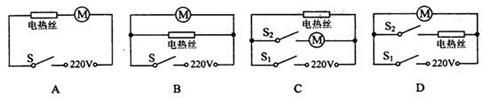 试题分析:电动机不工作时,电热丝不能发热;电热丝不发热时,电动机仍能工作,根据要求,不能简单的是串联电路,所以A错。若是B,电动机不工作,发热丝也在工作,B错误。C同理也不满足要求,只有D答案可以