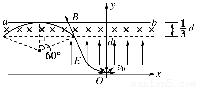 ,其中q与m分别为α粒子的电荷量和质量;在d<y<2d的区域内分布有垂直于xOy平面的匀强磁场.ab为一块很大的平面感光板,放置于y=2d处,如图所示.观察发现此时恰无粒子打到ab板上.(不考虑α粒子的重力)