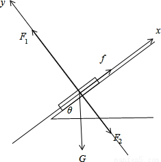 杆受重力G、斜面对杆的弹力F1,滚轮对杆的压力F2和滚轮对杆沿斜面向上的摩擦力f,四个力作用.建立直角坐标系,有: