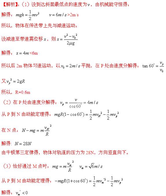 (3)试判断物块能否到达最高点M,若不能,请说明理由;若能,求出物块在M点对轨道的压力。