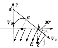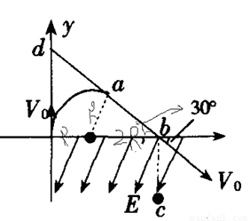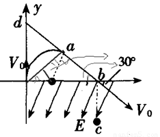 试题分析:(1)粒子在磁场中受洛仑兹力作用,作匀速圆周运动,设其半径为R,O点即进入磁场开始匀速圆周运动,粒子在磁场中的轨迹的圆心C必在x轴上,且b点速度切线x轴交点为b点,而b点不可能是圆心,所以b点在磁场区之外。过b沿速度方向作延长线,它与y轴相交于d点。