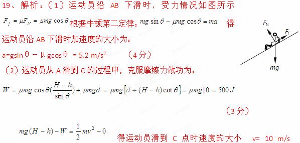 (2) 求运动员从A滑到C的过程中克服摩擦力所做的功W和到达C点时速度的大小υ;