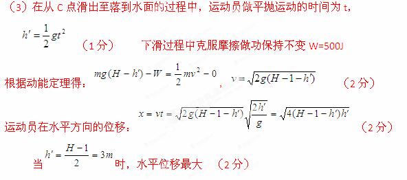 (3)保持水平滑道端点在同一竖直线上,调节水平滑道高度h和长度d到图中B′C′位置时,运动员从滑梯平抛到水面的水平位移最大,求此时滑道B′C′ 距水面的高度h′.