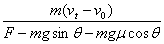 汽车质量为mkg,沿一个倾角为θ的斜坡向上运动,发动机牵引力为F牛,动摩擦因数为μ,当汽车沿斜坡的运动速度从v0增加到vt的过程中,需要的时间是多少?