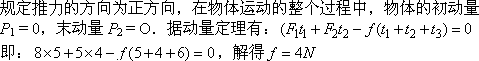 一个质量为m=2 kg的物体,在F1=8 N的水平推力作用下,从静止开始沿水平面运动了t1=5 s,然后推力减小为F2=5 N,方向不变,物体又运动了t2=4 s后撤去外力,物体再经过t3=6 s停下来.试求物体在水平面上所受的摩擦力.