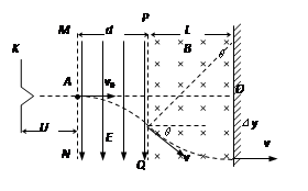 (22分)如图所示,K与虚线MN之间是加速电场。虚线MN与PQ之间是匀强电场,虚线PQ与荧光屏之间是匀强磁场,且MN、PQ与荧光屏三者互相平行.电场和磁场的方向如图所示。图中A点与O点的连线垂直于荧光屏。一带正电的粒子静止开始从A点离开加速电场,速度方向垂直于偏转电场方向射入偏转电场,在离开偏转电场后进入匀强磁场,最后恰好垂直地打在荧光屏上。已知电场和磁场区域在竖直方向足够长,加速电场电压与偏转电场的场强关系为U =