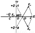 B、题中A、B、C三点电荷在D点产生的场强如图所示,大小相等,设EA=EB=EC=E,EA、EB的矢量和沿x轴正方向,大小也等于E,EC方向沿x轴负方向,故三个场强的矢量和为0,B选项正确;