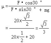 解: 力推物体匀速运动时, 物体受力情况如图甲所示, 由平衡条件得: F·cos30° = f ① F·sin30° + mg = N ② 且 f= μN ③