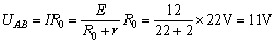 | (1)由图可知E=12V,当R=2W时,U=6V,则电源内电压U内=E-U=6V。因内外电压相等,内外电阻也应相等,所以及R=r,即r=2W (2)滑动触头位于最下端时UAB=0,滑动触头位于最上端时 |