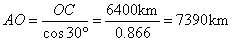 | 地球自转每小时转过的角度为15°,日落后2小时恰好在头顶的正上方看到卫星位置应在图中的A点,观察者应在地面上的B点,ACO构成直角三角形,∠AOC=30°,由几何知识可知